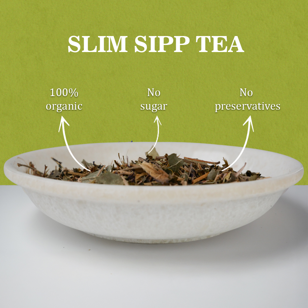 Slim Sip Tea is a herbal tea blend featuring Green Tea, Lemon, Dalchini, Garcinia, and other natural ingredients to support weight management and overall well-being.